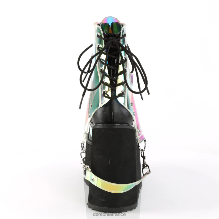 créez un ensemble tendance autour de la bottine Swing-115, votre portail vers la mode alternative excellence. cette pièce associe une plateforme compensée de 5 1/2 pouces avec un devant à lacets confiant, le tout enveloppé dans un trio dynamique de cuir végétalien noir, de cuir verni et de faux cuir miroir magique. avec son harnais en PVC amovible et sa sangle de bondage suspendue accrocheuse, cette botte invite à un look soigné. une fermeture zippée intérieure en métal complète la silhouette, reflétant un penchant pour l’artisanat détaillé et un dévouement à une esthétique audacieuse et alternative.