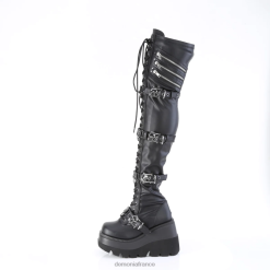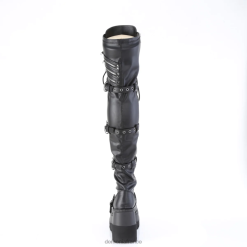 rehaussez votre look avec le shaker-420 ¨c, une cuissarde à plateforme compensée ultra-chic avec une attitude audacieuse. le design à lacets sur le devant, la quadruple sangle à boucle tête de mort et les détails décoratifs de la fermeture éclair auront un impact sur n’importe quelle tenue. la fermeture éclair latérale intérieure complète permet un enfilage et un retrait faciles, tandis que le cuir végétalien extensible noir assure un ajustement parfait. Idéales pour celles qui aiment exprimer leur style avant-gardiste, ces cuissardes ajoutent la touche d’attitude idéale à n’importe quelle tenue.